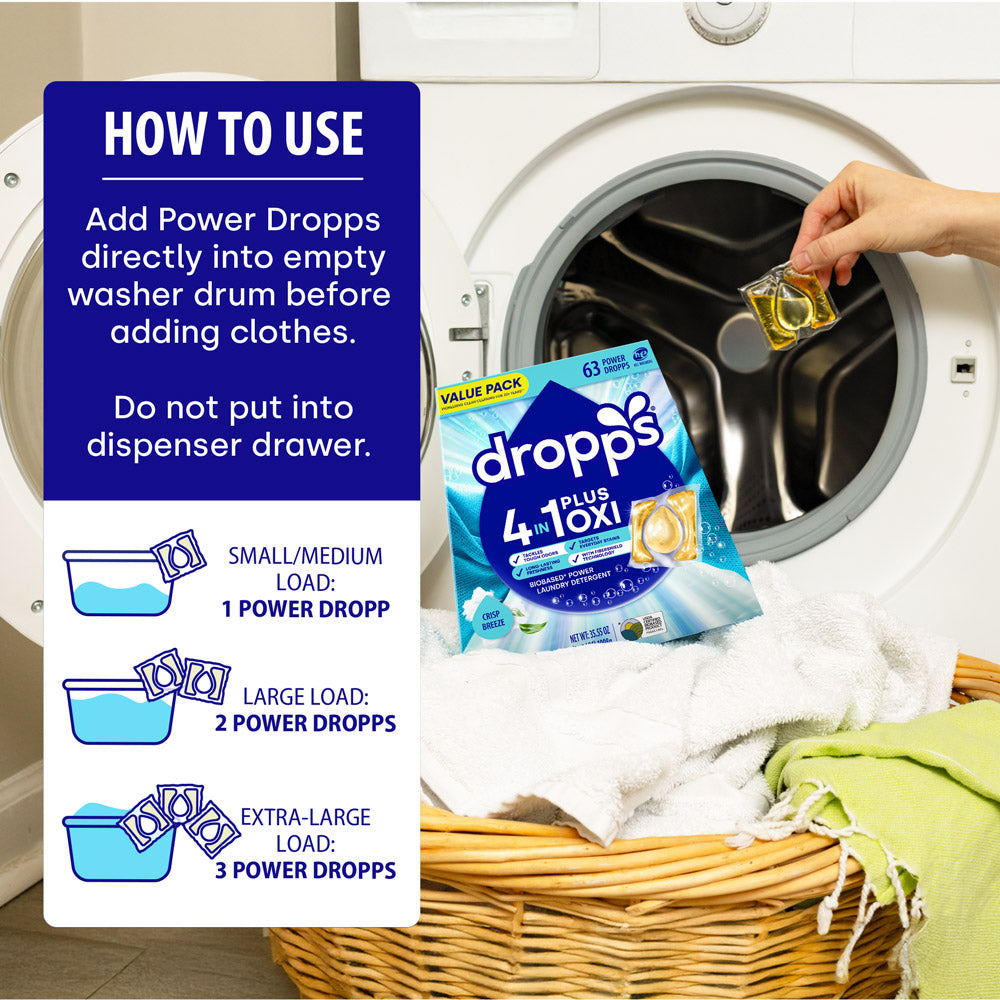 • 4-in-1 Plus Oxi Detergent: Add POWER DROPPS directly into empty washer drum before adding clothes. Do not put into dispenser drawer. Always handle POWER DROPPS with dry hands. Do not unwrap, puncture, or pull apart stuck-together POWER DROPPS. Suitable for all machines. Works in all water temperatures. Septic safe. Store in a dry place, out of reach of children and pets.