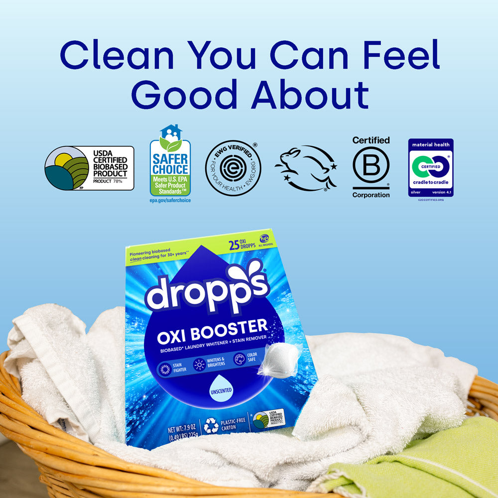 - Dropps micro-bubbling Oxygen Power Technology and fabric-enhancing enzymes break down tough stains, restore color vibrancy, and reduce pilling.