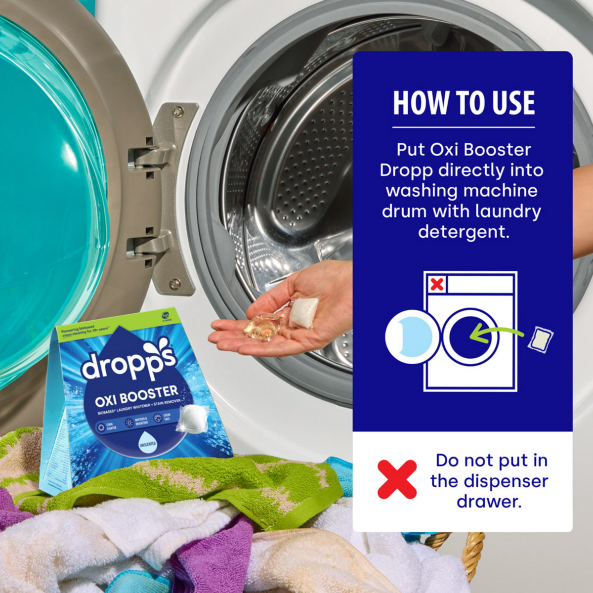 - HOW TO USE: Place one OXI BOOSTER DROPP along with detergent directly into the washing machine drum before adding laundry. Do not put into dispenser drawer. Always handle OXI BOOSTER DROPPS with dry hands. Do not unwrap, puncture, or pull apart stuck-together OXI BOOSTER DROPPS. Suitable for all machines. Works in all water temperatures. Septic Safe.