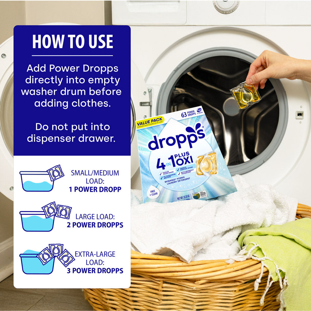 • HOW TO USE: Add POWER DROPPS directly into empty washer drum before adding clothes. Do not put into dispenser drawer. Always handle POWER DROPPS with dry hands. Do not unwrap, puncture, or pull apart stuck-together POWER DROPPS. Suitable for all machines. Works in all water temperatures. Septic safe. Store in a dry place, out of reach of children and pets.