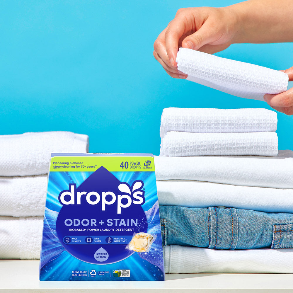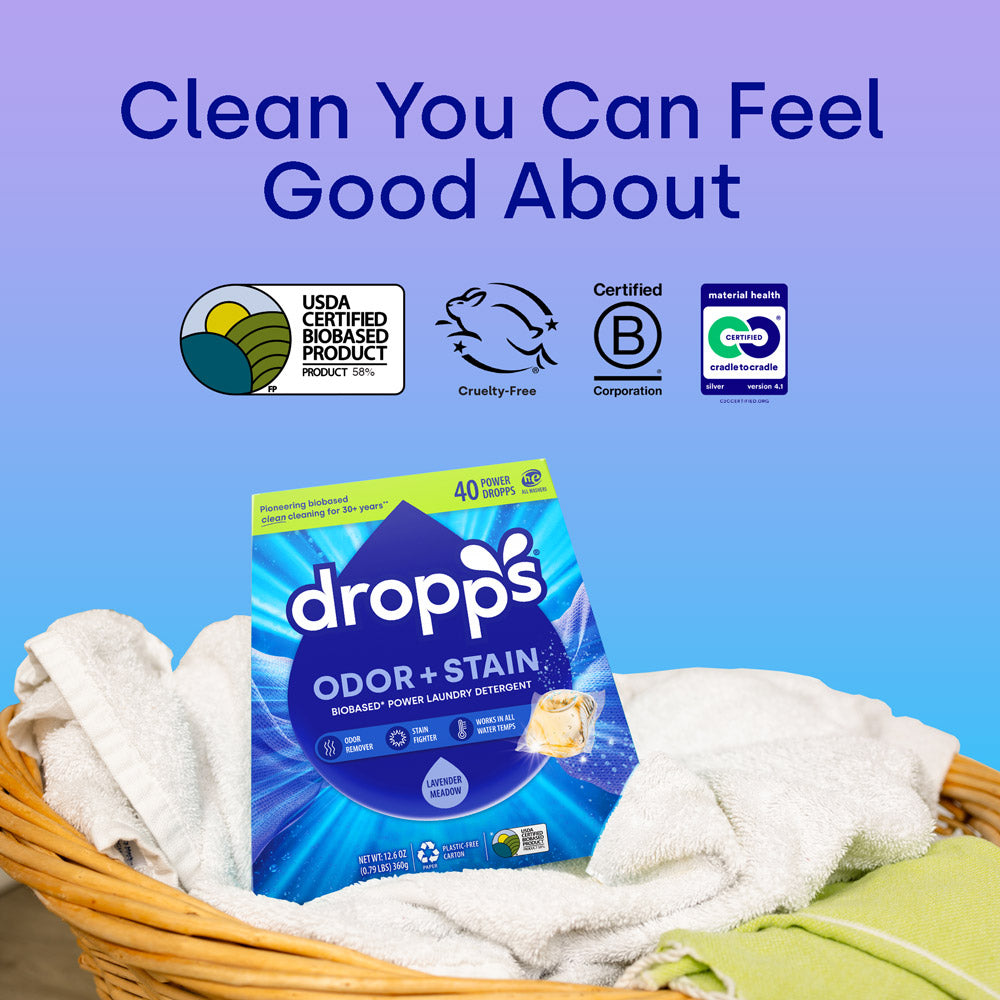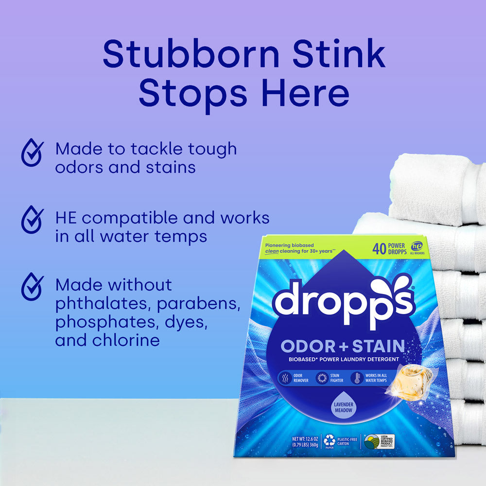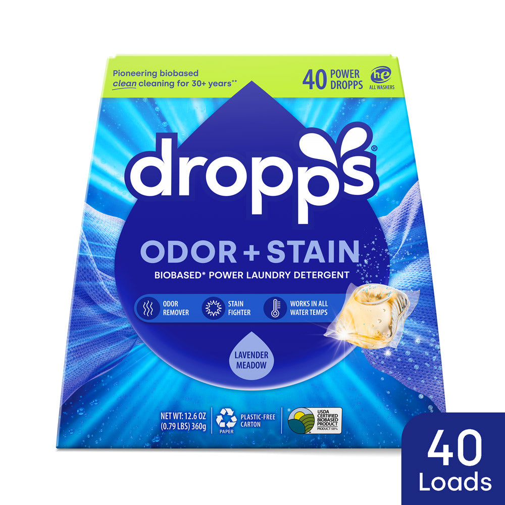 Banish odors and tackle tough stains with Dropps Odor + Stain Laundry Detergent Pods. This biobased formula contains a cutting-edge combo of surfactants, enzymes, and anti-odor technology to keep clothes fresh and clean, leaving behind a lavender and eucalyptus scent that lasts. Just toss one pod into the washer drum before you load your laundry. This powerful little pod will take care of the rest.