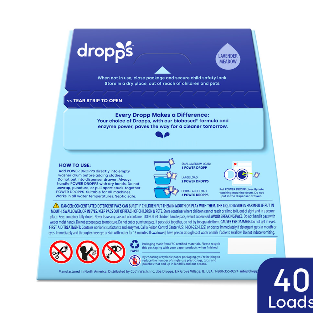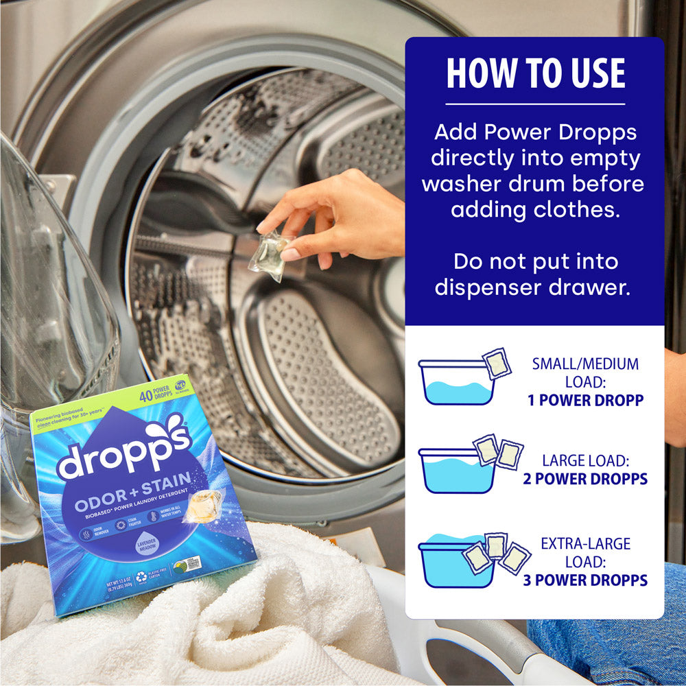 • HOW TO USE: Add POWER DROPPS directly into empty washer drum before adding clothes. Do not put into dispenser drawer. Always handle POWER DROPPS with dry hands. Do not unwrap, puncture, or pull apart stuck-together POWER DROPPS. Suitable for all machines. Works in all water temperatures. Septic safe. Store in a dry place, out of reach of children and pets.